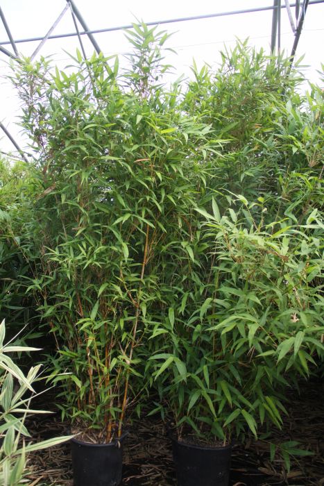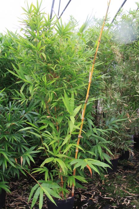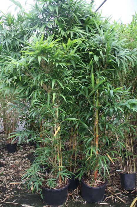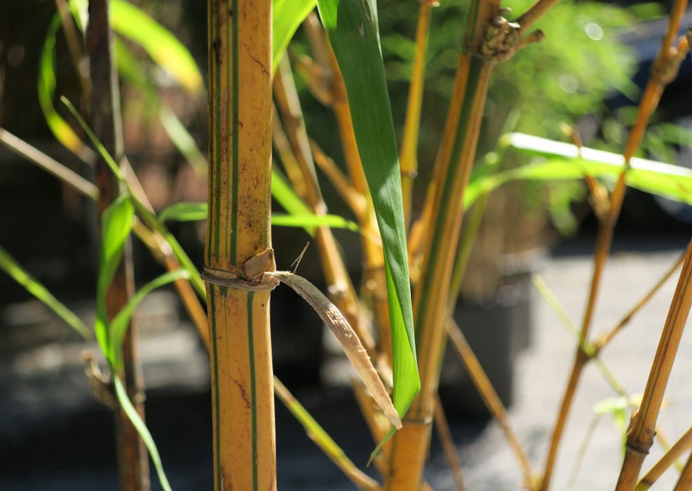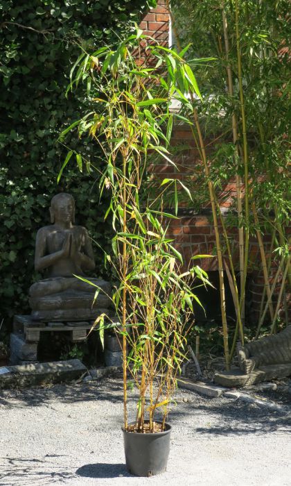 Mit dem ausladenden Wuchs, großen Blättern und kräftigen Halmen einer der beliebtesten Bambusa. Die gelben Halme mit unregelmäßigen grünen Streifen treiben im Sommer farbenfroh aus und können bei ausreichend Platz und guten Bedingungen auch im Kübel recht große Durchmesser haben.