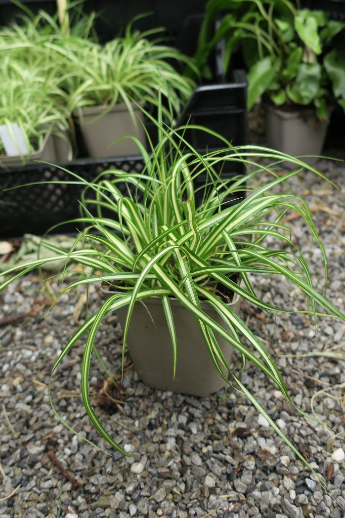 Blätter: schmallinealisch, dunkelgrün mit breiten cremegelben Streifen, überhängend, wintergrün, horstbildend, sehr dekorativ auch im Winter