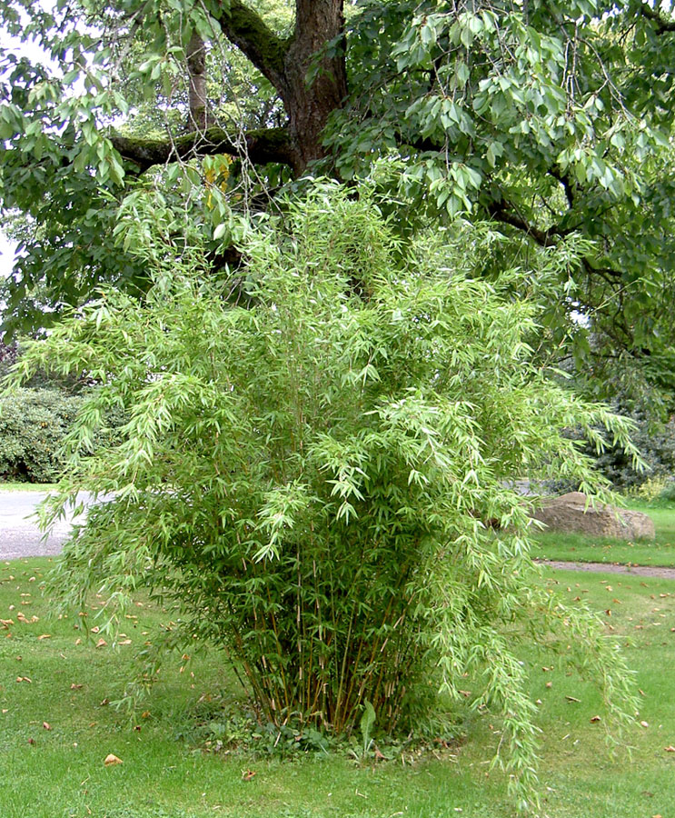 Höhe: 3 bis 4 m, im Alter bis 7 Meter, schnellwachsend Halme: stämmig, grün, Spitze leicht gebogen, im Alter oliv bis gelblich, bis 1,5 cm Ø Blätter: klein, mittelgrün Wuchs: dicht, aufrecht, horstig Standort: halbschattig bis sonnigsonnig bis schattig Winterhärte: bis -18°. Bei etwas tieferen Temperaturen Winterschutz. Unterirdisch bis -26°. Vor Spätfrösten schützen Platzbedarf: ab 2 m Ø. Später abstechen. Verwendung: großer Solitär, Hecke, höherer Sichtschutz, am Teich und Bachlauf, schnittverträglich, gute Kübelpflanze für große Kübel ab Ø