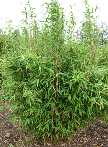 Eine relativ neue, sehr dekorative und wüchsige Sorte mit kräftigen rötlich bis rotbraun ausfärbenden Halmen und dichter Belaubung. Besonders für wärmere Regionen und sonnige Standorte geeignet.Höhe: bis ca. 4 m Halme: grün, bläulich bemehlt, rötlich ausfärbend, gerade, Spitze bogig, bis 1,5 cm Ø Blätter: fest, sattgrün, klein, 6 bis 7 cm Wuchs: aufrecht, dicht, kompakt, bogige Spitzen, feine Belaubung, horstig Standort: sonnig bis halbschattig, Wärme vertragend Winterhärte: -18°/-26° Platzbedarf: Ø ab ca. 1,5 m Verwendung: