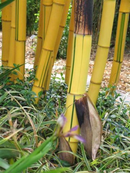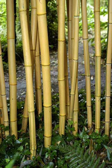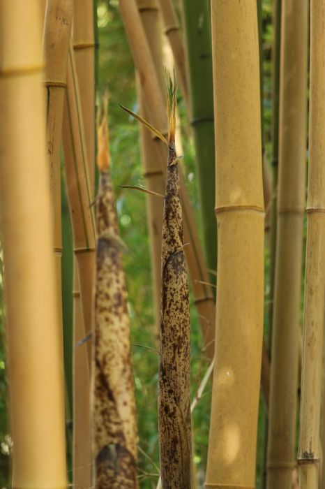 Halme: im Austrieb zartgelb, später leuchtend gelb bis ocker, unregelmäßige grüne Streifen, rillig, häufig brüchig, dicke Halme, bis 6 cm Ø, an guten Standorten auch mehr