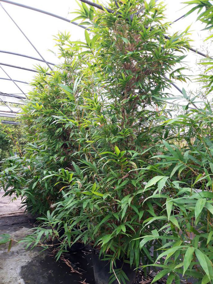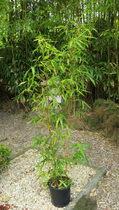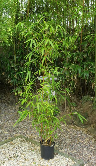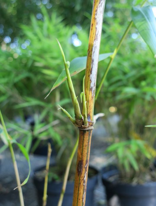 Mit dem ausladenden Wuchs, großen Blättern und kräftigen Halmen einer der beliebtesten Bambusa. Die gelben Halme mit unregelmäßigen grünen Streifen treiben im Sommer farbenfroh aus und können bei ausreichend Platz und guten Bedingungen auch im Kübel recht große Durchmesser haben.