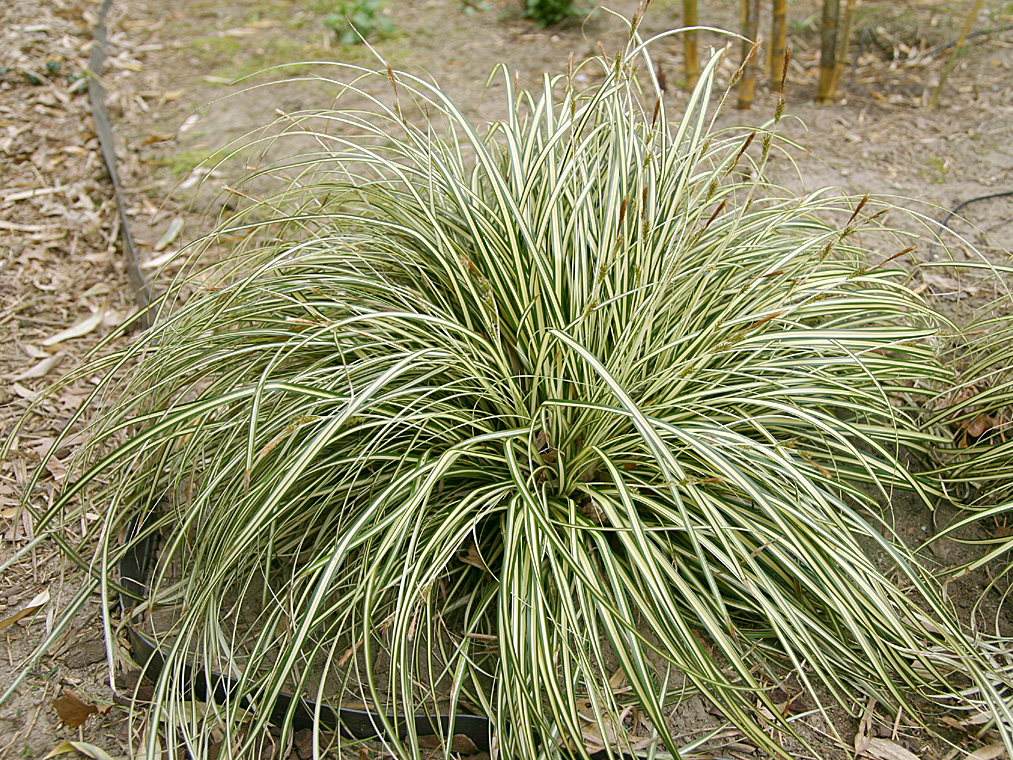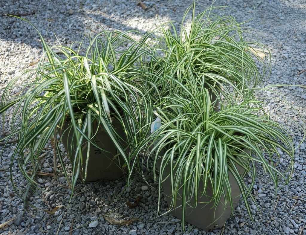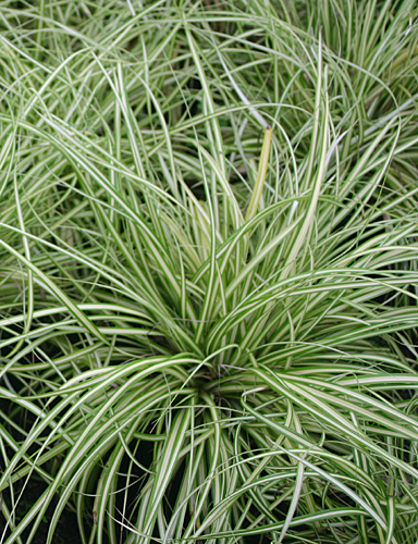 Blätter: schmallinealisch, dunkelgrün mit breiten cremegelben Streifen, überhängend, wintergrün, horstbildend, sehr dekorativ auch im Winter