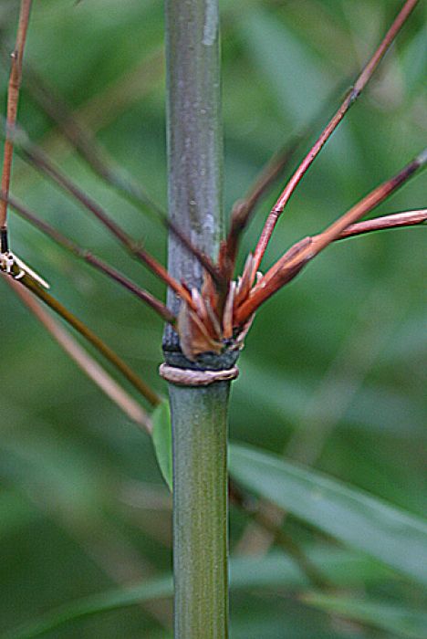 Halme: blau, purpur ausfärbend, später blaugrau bis grün, dekorative orange bis rotbraune Halm- und Zweigscheide, Halmabstand im Alter bis 20 cm, bis 12 mm Ø