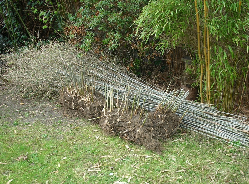 Die 2., für das Ausleben des Bambusses sicherlich bessere, aber arbeitsintensivere Möglichkeit: Sie verschließen die Folie nicht, sondern lassen einen ca. 40 Zentimeter breiten Ausgang offen. In diesem Bereich kann mit Laub oder Stroh aufgefüllt werden. Allerdings sollte dieser 'Ausgang' bis auf die Grabentiefe laufend kontrolliert und ausbrechende Rhizome sollten entfernt werden. Die über den Rand der Sperre kriechenden Rhizome müssen ebenfalls regelmäßig abgeschnitten und entfernt werden. So kann sich der Bambus ausleben, ohne sich in Ihrem Garten auszubreiten.