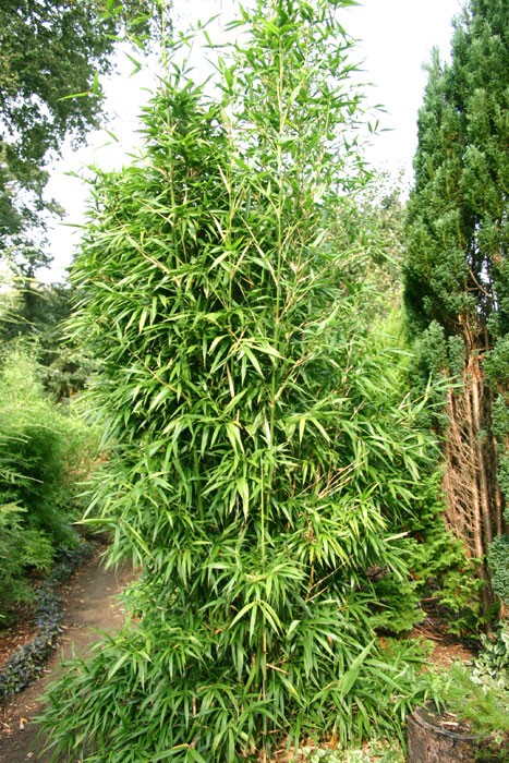 Semiarundinaria fastuosa mit rötlich ausfärbenden Halmen und die grünhalmige Form ‚Viridis‘ wachsen straff aufrecht und sind mit den relativ großen Blättern besonders für wärmere Standorte zu empfehlen. Beide Bambusse aus der Gattung Semiarundinaria wachsen mit ihren kurzen Zweigen wie Säulen. Sie können Höhen von 4 bis 8 Metern erreichen.