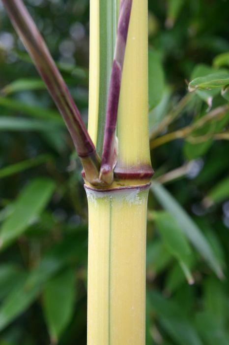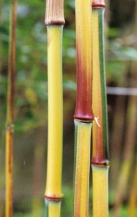 Halme: rau, hellgelb, in der Sonne rötlich bis rot ausfärbend, grüne Streifen im Sulcus, untere Internodien oft zick-zack-förmig gebogen, bis 4 cm Ø, dekorativer Austrieb