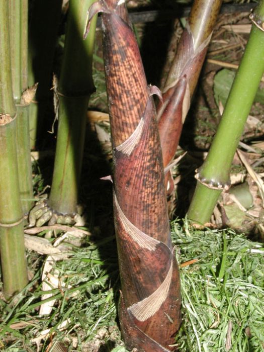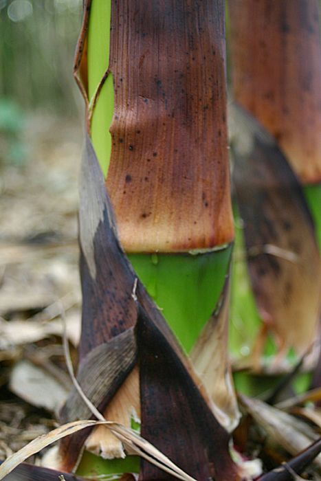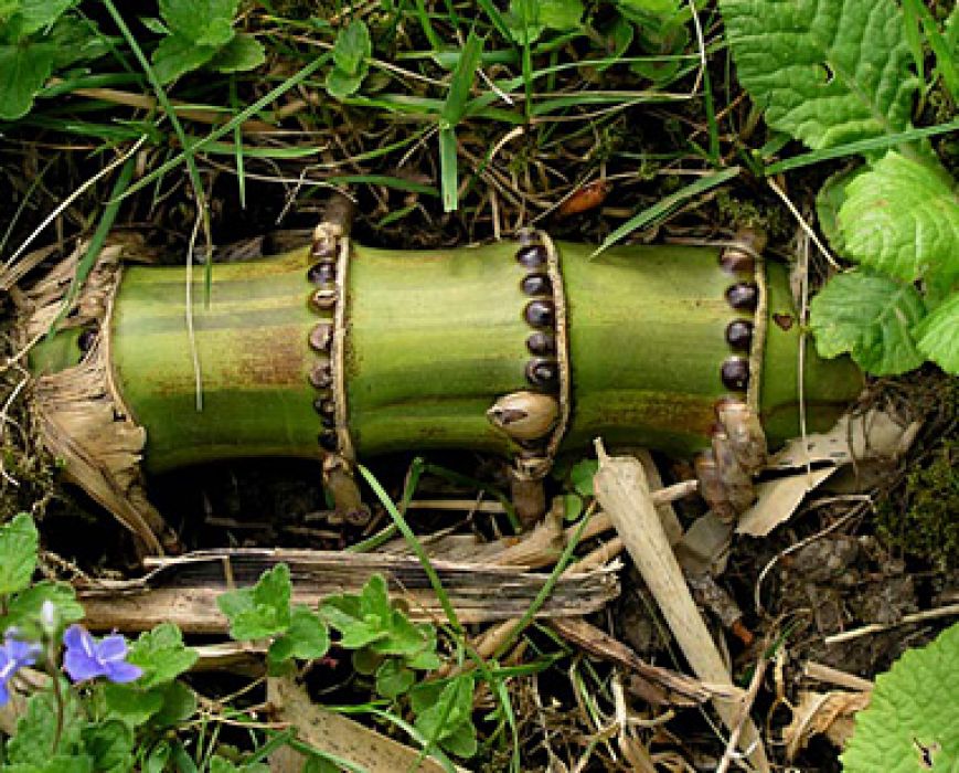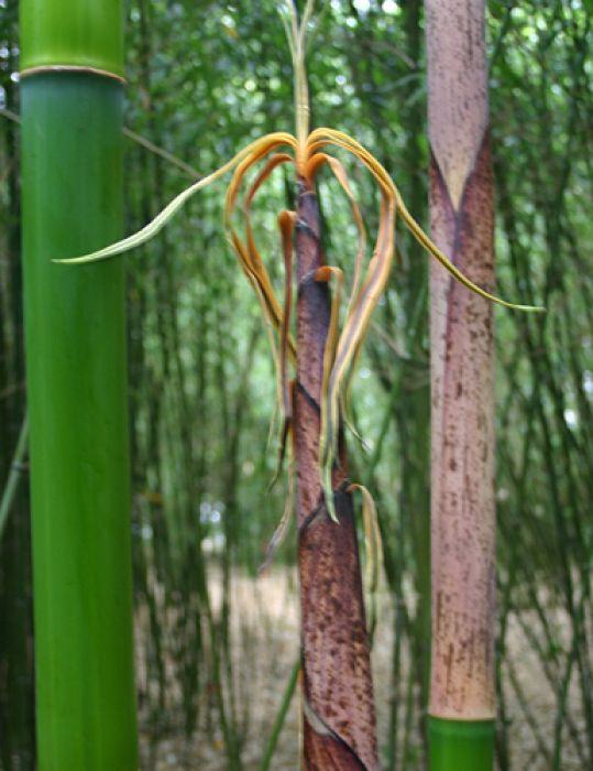 Halme: anfangs blau-grau bemehlt, später grün mit gelben Streifen, die im Alter bis bräunlich ausfärben, flammende Austriebe, dicke Halme bis 6 cm Ø